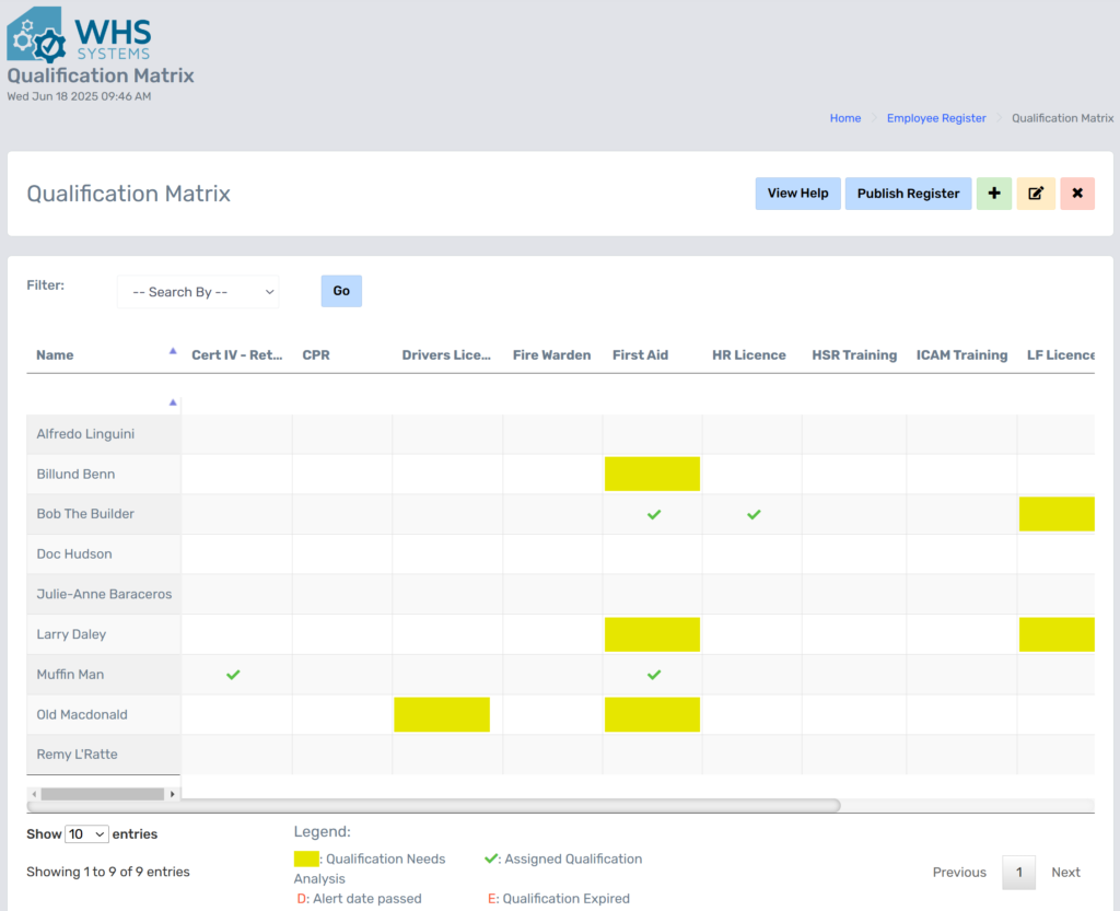 If you relate certain qualifications to a position, any employee who has been related to that position who does not have the appropriate qualification will be highlighted as yellow in the Qualification Matrix, automatically creating a Training Needs Analysis (TNA).